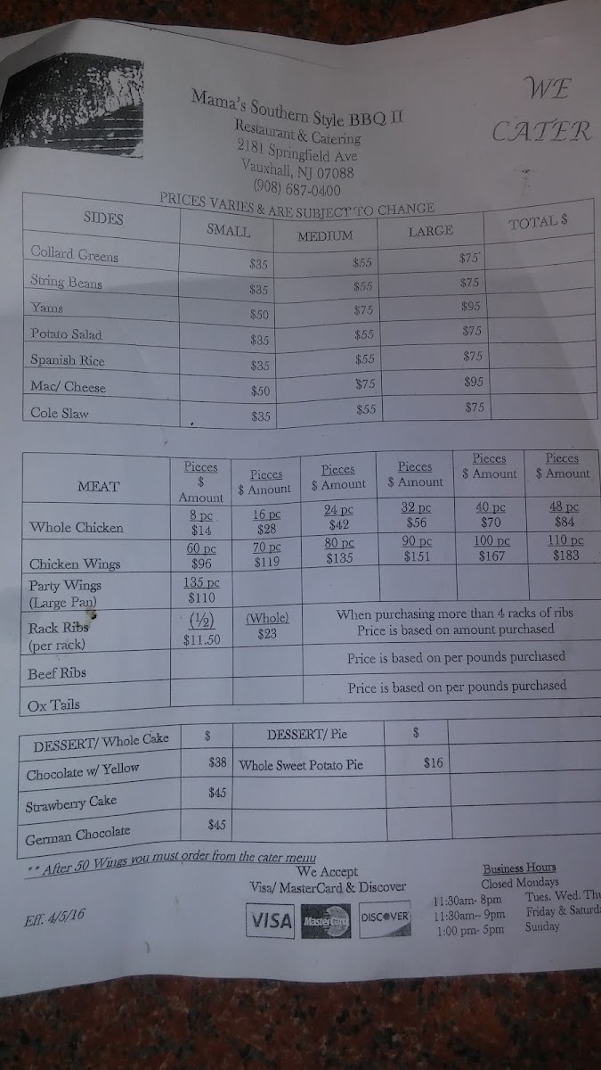 Welcome to MaMa's Southern Style BBQ 2, situated at 2083 Springfield Ave, Vauxhall, NJ. This hidden gem serves authentic Southern cuisine that brims with flavor and comfort. Their extensive menu features mouthwatering dishes like BBQ Pork Ribs, Fried Chicken Wings, and Oxtails, all paired with your choice of tantalizing sides such as Collard Greens, Baked Mac and Cheese, and Spanish Rice.